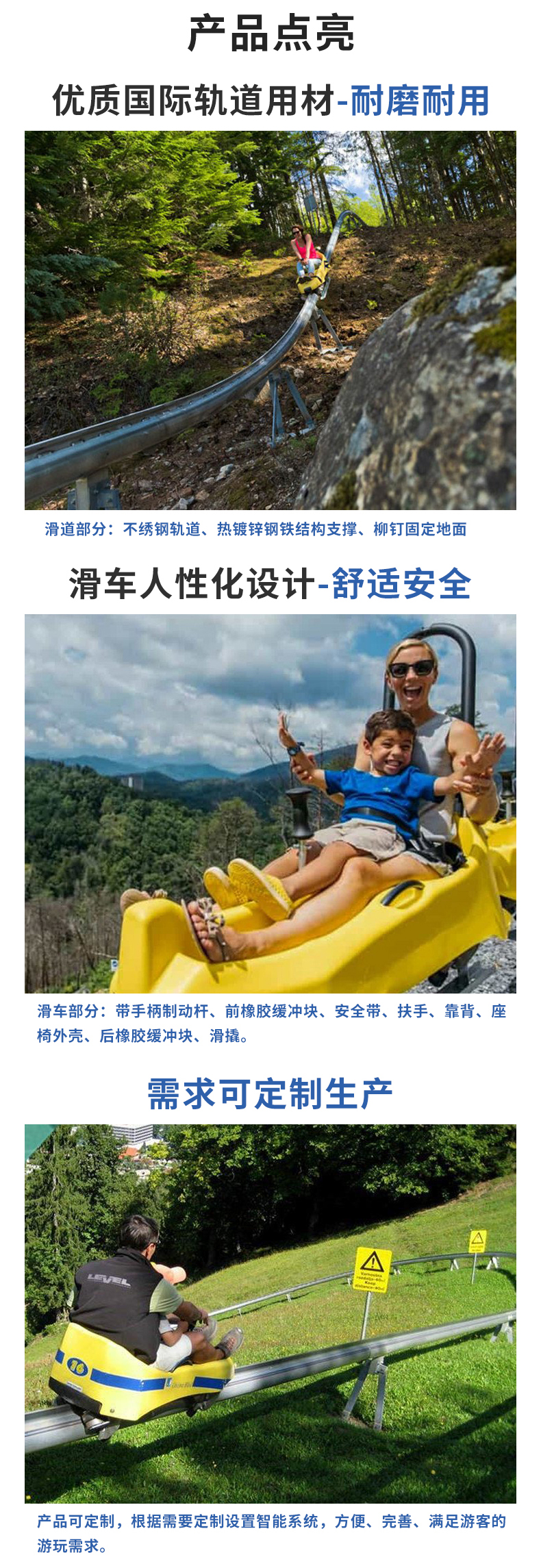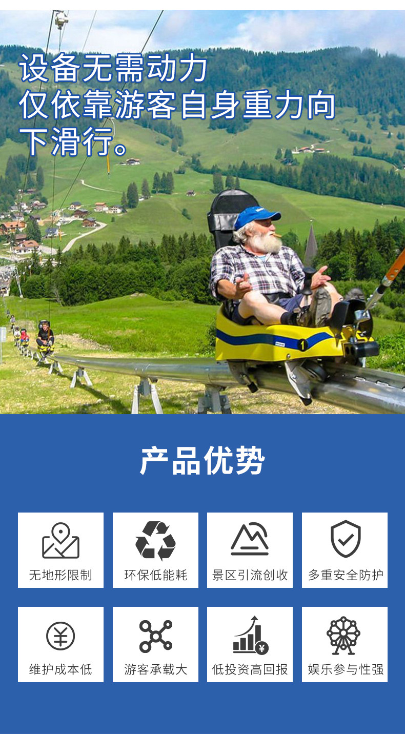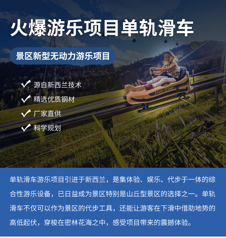 單軌式滑道不僅可以作為景區(qū)代步工具、還能讓游客在下滑中借助地勢(shì)的高低起伏,穿越在密林花海之中,感受項(xiàng)目帶來(lái)的震撼體驗(yàn),具有參與性的娛樂設(shè)施,日益受人們歡迎,是景區(qū)中一種投資低、見效快的新型娛樂與代步為一體的娛樂設(shè)施。
